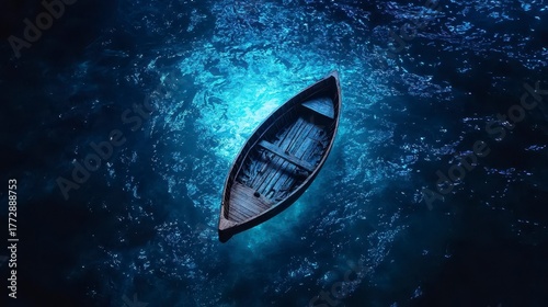 A solitary wooden boat floating on shimmering blue waters illuminated by a serene underwater light