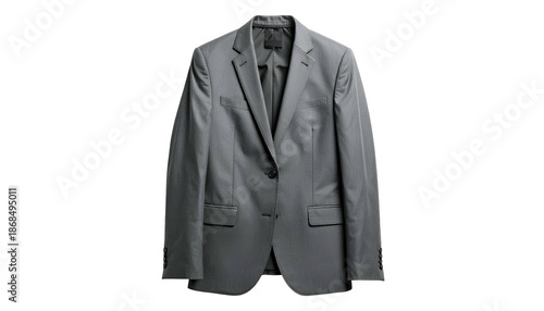 jacket, blazer, grey, suit, formal, apparel, clothing, fashion, fabric, wool, texture, buttons, collar, lapel, sleeve, pocket, style, modern, classic, elegant, professional, business, office, man, dress, outerwear, tailored, fit, clean, crisp, simple, minimalist, isolated, monochrome, neutral, dark, light, shade, shadow, structure, composition, detail, perspective, studio, shot, object, empty, background, plain
