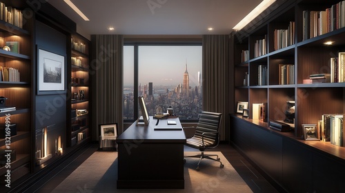 a sophisticated modern home office with a dark wood desk, built-in bookshelves, a comfortable ergonomic chair, and soft ambient lighting.