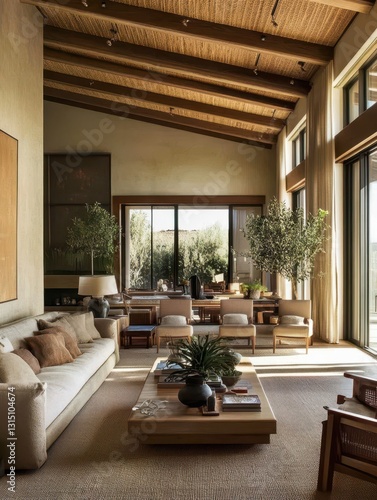 interior, living, room, furniture, couch, sofa, pillow, wooden, hot drink, table, plant, vase, art, painting, framed, lamp, lighting, window, view, chair, carpet, rug, floor, ceiling, beam, natural, light, design, style, decor, modern, home, space, comfort, peaceful, serene, inviting, open, airy, large, minimalist, neutral, earth, tone, greenery, elegance, residential