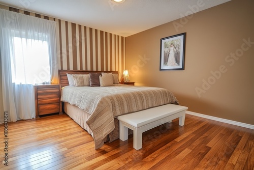 A spacious and modern bedroom with a king-size bed, striped wallpaper, hardwood floors, and a white bench at the foot of the bed.