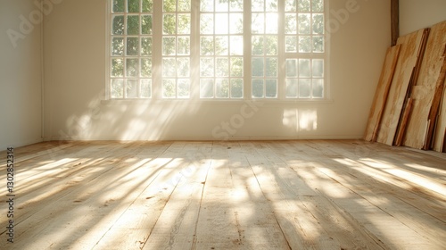 A spacious minimalist room bathed in bright natural light, featuring wooden flooring and large windows, exemplifying tranquility and simplicity in design.