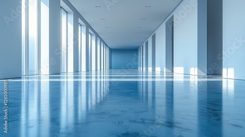 A spacious, modern corridor with large windows reflecting light on a polished floor.