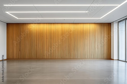 A spacious room with a large wooden paneled wall, a white ceiling with recessed lighting, and a concrete floor.