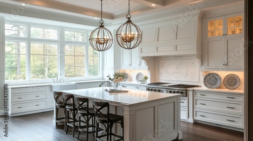 A spacious white kitchen with retro-style pendant lights and decorative plates.