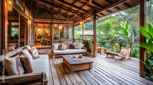 terrace, wooden, roomy, exotic, bungalow, rainforest, lush, jungle, seating, comfortable, panoramic, view, nature, tropical, serene, tranquil, relaxing, cosy, inviting, open air, organic, natural, stylish, rustic, harmony, greenery, peaceful, airy, retreat, scenic, elegant, warm, luxurious, aesthetic, environmentally friendly, charming, breathtaking, refreshing, secluded, intimate, bright, modern, sophisticated, welcoming, vibrant