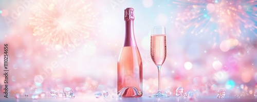 A sparkling wine bottle and glass are set against a festive, colorful background, evoking celebrations and joyous moments.