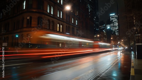 city, night, street, tram, train, light, blur, motion, speed, red, orange, building, architecture, urban, city landscape, dark, rain, wet, asphalt, road, transportation, public, transport, travel, journey, movement, dynamic, energy, vibrant, bright, glow, illumination, perspective, photo, image, graphic, modern, contemporary, metropolis, downtown, commercial