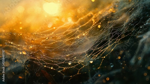 A spider web glimmering with dew drops in the early light, fine threads catching the sun's glow, blurred natural tones providing depth.