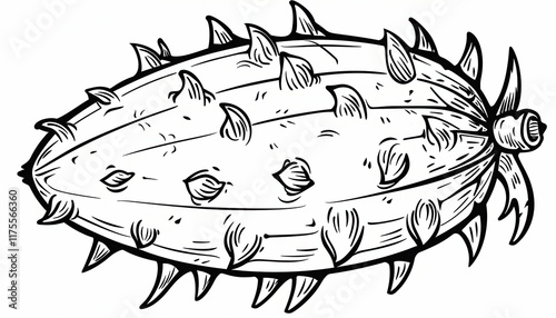 fruit, exotic, spiky, oblong, illustration, food, cardboard box, menu, education, texture, unusual, african, horned, melon, cucumber, jelly, ripe, fresh, healthy, vitamin, alimentary, diet, vegetarian, vegan, organic, natural, raw, epicure, delicacy, seed, tropical, summer, harvest, farm, market, grocery, shop, eatery, cafes, receipe, cookbook, design, drawing, graphic, art, clip art, line, black