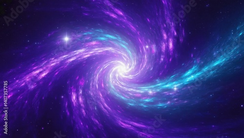 A spiral galaxy with purple and blue swirls and stars. The galaxy is full of stars and has a bright light at the center