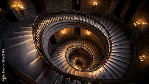 A spiraling staircase with ornate railings, surrounded by dim lighting and elegant architectural features. Concept Spiraling Staircase, Ornate Railings, Dim Lighting, Elegant Architecture