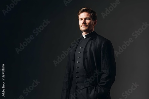 cassock, clergyman, religious, attire, traditional, studio, lighting, fabric, texture, buttons, confidence, portrait, priest, clothing, garment, style, solemn, serious, faith, spirituality, formality, uniform, isolated, ecclesiastical, clergy, holy, ceremony, minister