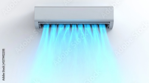 A split air conditioning unit mounted on a white wall, operating with cool airflow visible.