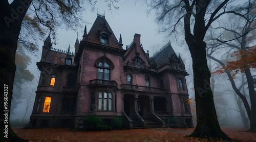 A spooky Gothic Style mansion in the middle of a dark, foggy forest.