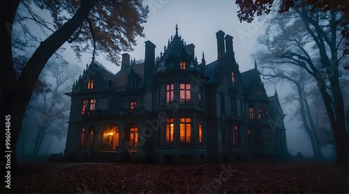 A spooky Gothic Style mansion in the middle of a dark, foggy forest.