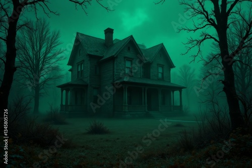 house, eerie, creepy, tree, dark, fog, mist, gloomy, wood, branch, green, skittish, old, mysterious, haunted, scarey, night, atmosphere, exterior, isolated, landscape, autumn, season, home, building, architecture, rural, ominous, cold, stillness, quiet, desolate, shadow, porch, window, structure, chimney, bare, backyard, lawn, yard, foliage, vegetation, wooden, overcast, sky