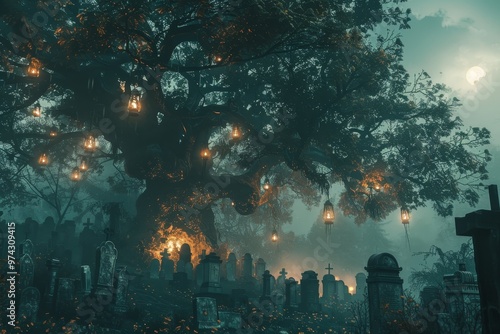 A spooky, misty graveyard with a large tree adorned with glowing lights. The scene is perfect for Halloween, horror, or mystery themes.
