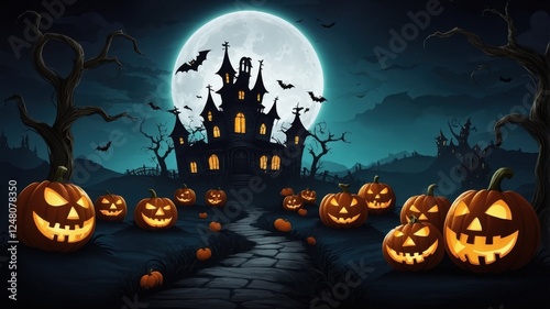 A Spooky Scene of Pumpkins, Bats, and a Glowing Full Moon