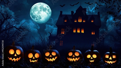 A spooky scene with a row of jack-o'-lanterns flickering in the foreground as a full moon rises over a haunted house silhouetted against the night sky