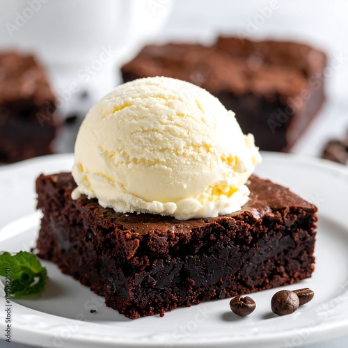 brownie, ice cream, vanilla, chocolate, dessert, sweet, food, tasty, epicure, rich, dark, square, plate, white, creamy, scoop, indulgent, delicious, cocoa, hot drink, bean, texture, soft, cake, treat, bakery, homemade, fresh, warm, closeup, perspective, angle, sugar, appetence, craving, satisfaction, elegant, simple, composition, breakfast, lunch, dinner, party, celebration, sharpened, detail, photo, lifestyle
