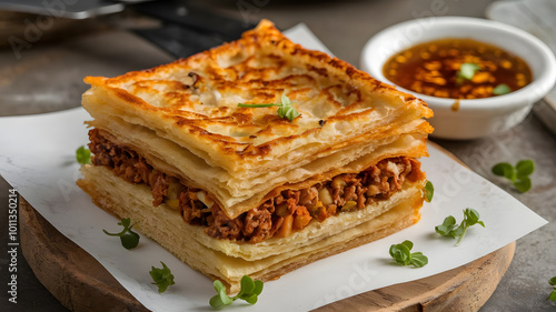 A square piece of Murtabak, a flaky and crispy stuffed flatbread filled with spiced meat or vegetables, featuring a golden crust and visible dough layers, served with a small bowl of tangy dipping sau