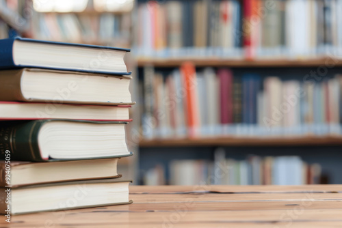 A stack of books on a wooden table with a blurred library background, perfect for education and reading themes.