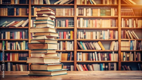 A stack of books piled high in a library , education, reading, literature, knowledge, studying, intelligence