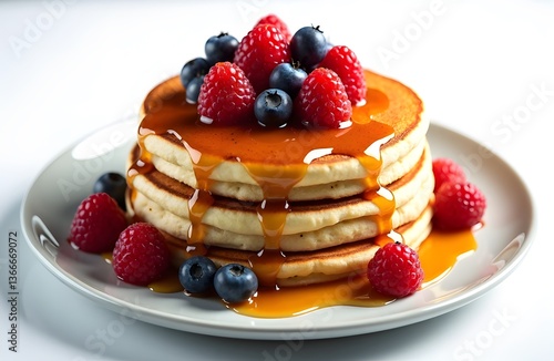A stack of fluffy pancakes drizzled with maple syrup and topped with fresh berries isolated on a white background