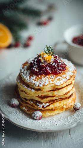 A stack of fluffy pancakes is generously topped with fresh berries and a dusting of powdered sugar, creating a delightful seasonal breakfast treat