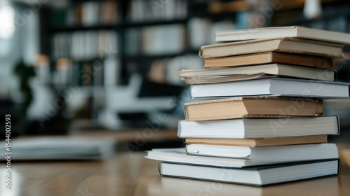 A stack of neatly arranged books on a wooden table, surrounded by a cozy library setting, showcasing the beauty of literature and knowledge waiting to be explored.