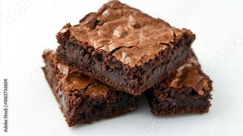 A stack of rich, chocolate brownies on a white background, showcasing a delicious dessert.