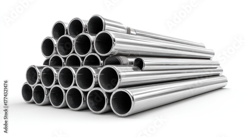A stack of silver metal pipes on a white background.
