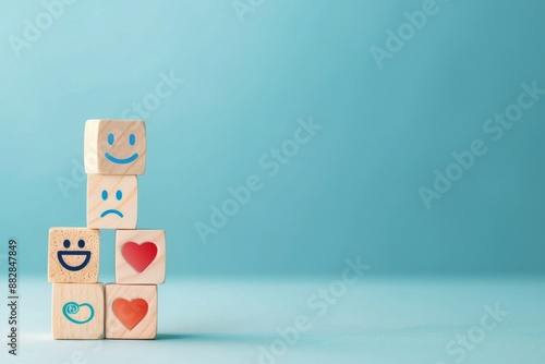 wooden, block, stack, stacked, blue, background, smiley, face, face, frown, frowning, nubes, heart, symbol, painted, positive, negative, emotion, feeling, happiness, sorrowful, love, symbol, happy, sad, toy, toy, symbolic, abstract, colourful, design, simple, minimal, minimalist, creative, graphic, macro, closeup, object, object, visual, aid, representation, concept, idea, conceptual, art, symbolism