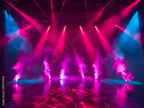 A stage with lights and smoke is lit up in a pink and blue color scheme. The lights are arranged in a way that creates a sense of movement and energy. The smoke adds to the dramatic effect