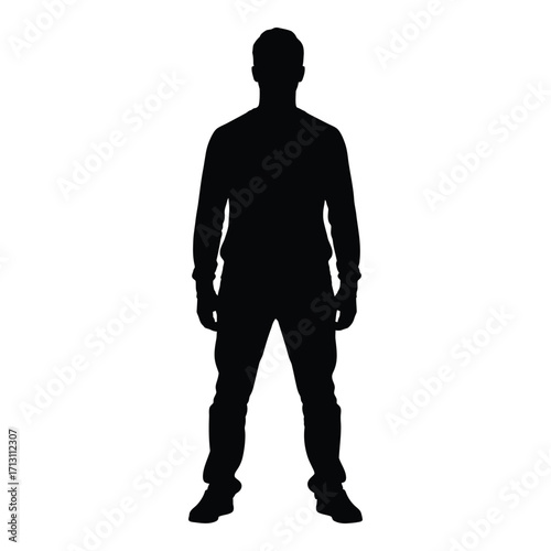 figure, human, form, darkness, contrast, shape, standing, posture, isolated, graphic, design, illustration, black, white, minimalist, simple, clean, abstract, negative space, monochrome, solid, outline, profile, body, torso, leg, foot, arm, hand, clothing, casual attire, silhouette, shadow, visual, artistic, composition