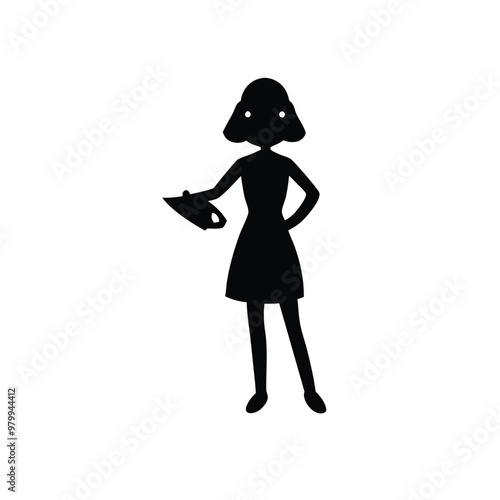a standing girl holding a iron in his hand, black color silhouette vector art, isolated white background