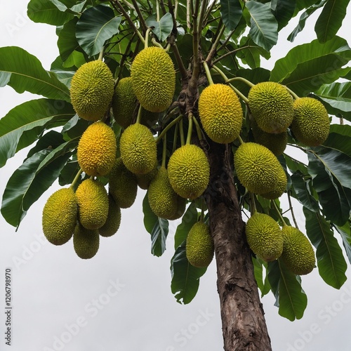A starfruit tree with glossy green leaves and golden star-shaped fruits on a white background.