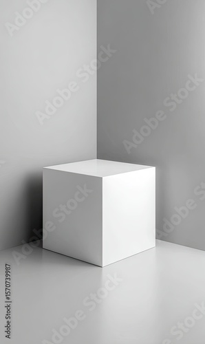 A stark white cube sits in a neutral corner, subtly lit, against a grey backdrop, creating a minimalist and clean aesthetic
