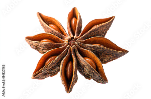 A star-shaped anise seed pod showing textured brown outer shell and glossy seeds inside