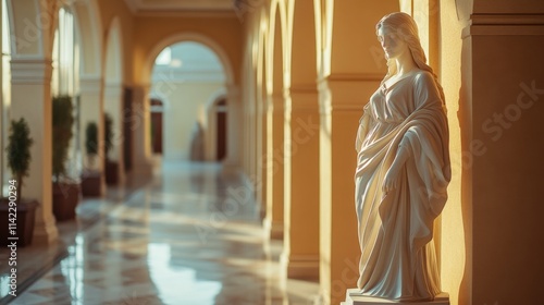 statue, hallway, arch, architecture, building, column, corridor, marble, art, interior, light, structure, design, indoor, stone, sculpture, path, white, beige, wall, space, classical, artwork, hall, paseo, potted plants, perspective