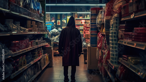 A stealthy thief, seen from behind, navigates a store, ready to commit a clandestine act. in a raincoat generative AI.