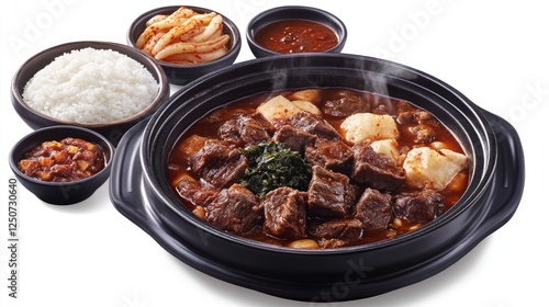 A steaming bowl of Gamjatang with a side of rice and traditional Korean side dishes.