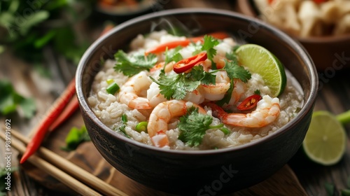 A steaming bowl of seafood rice porridge garnished with fresh herbs, sliced chilies, and a squeeze of lime, served with chopsticks, inviting diners to enjoy a comforting meal.