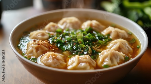 A steaming bowl of wonton soup, its broth rich and aromatic, garnished with vibrant bok choy, each bite a symphony of textures and flavors.