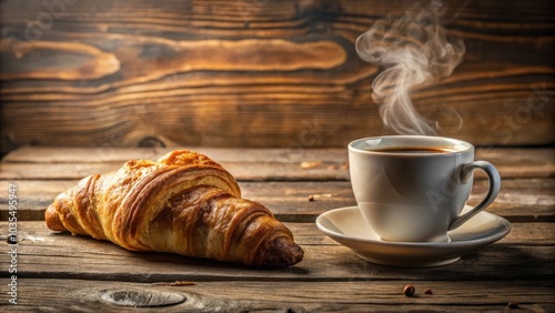 A steaming cup of coffee and a freshly baked croissant resting on a rustic wooden table.