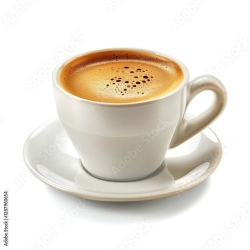A steaming cup of coffee in a minimalist white mug on a saucer, inviting and warm.