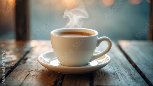 A steaming cup of coffee on a rustic wooden surface with a blurred outdoor background.