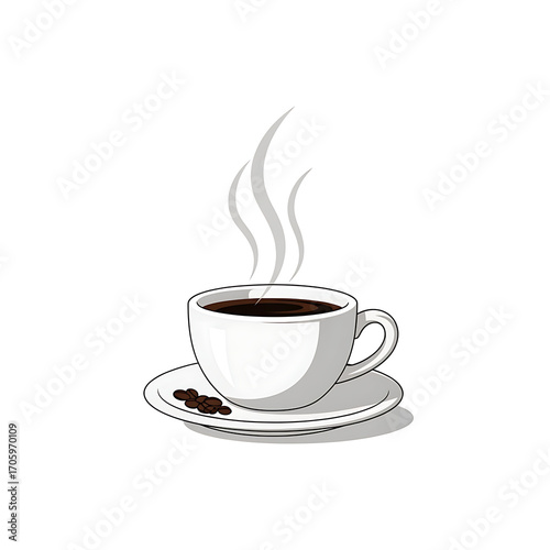 hot drink, cup, saucer, bean, steam, hot, drink, beverage, caffeine, aroma, morning, breakfast, warm, comfort, energy, dark, brown, white, porcelain, ceramic, illustration, graphic, design, simple, minimalist, isolated, background, white background, vector, artwork, image, picture, drawing, vignetting, art, visual, element, cafes, cafes, eatery, kitchen, home, office, work, relax, break, delicious, tasty, invigorating
