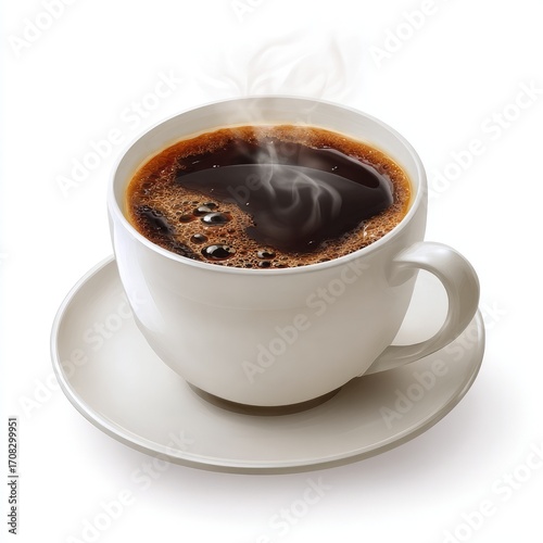 hot drink, cup, mug, saucer, steam, hot, drink, dark, brown, white, ceramic, frothy, foam, brew, morning, energy, arousing, delicious, warm, espresso, caffeinated, refresh, promoting, beverage, hot beverage, caffeine, stimulant, simple, isolated, image, digital, illustration, graphic, realistic, three-dimensional, smooth, rich, intense, aroma